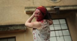 One Cut of the Dead opens with a character played by Chinatsu (Yuzuki Akiyama) leveling an axe at Ko...